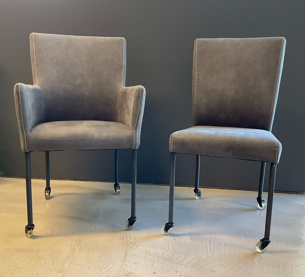 Stoel Living stof paars 295,00/leer 395,00/hocker leer 75,00